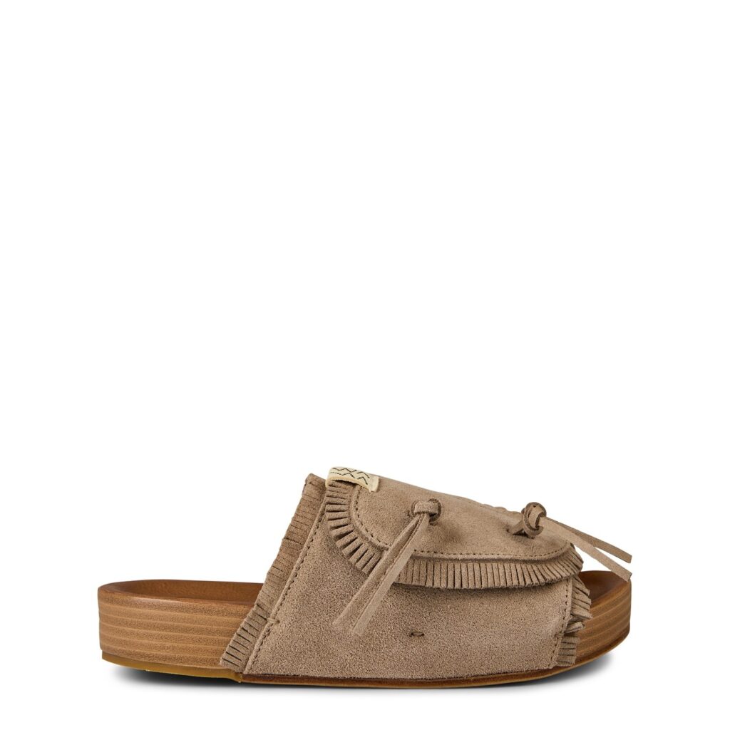 Tan suede clogs with fringe detailing and beaded embellishments, viewed from above on a white background.
